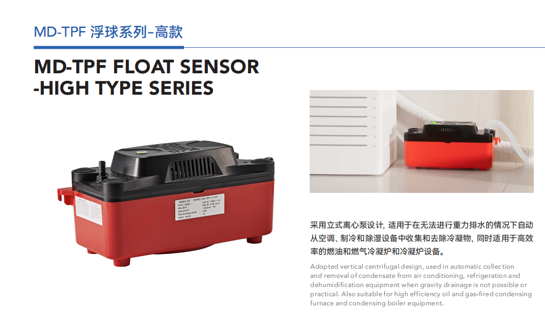設計用于在無法進行重力排水的情況下自動從空調,制冷和除濕設備中收集和去除冷凝物。也適用于高效率的燃油和燃氣冷凝爐和冷凝鍋爐設備。